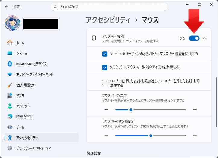 マウスキー機能のスイッチをオンにします。これでマウスキー機能が有効化されました。