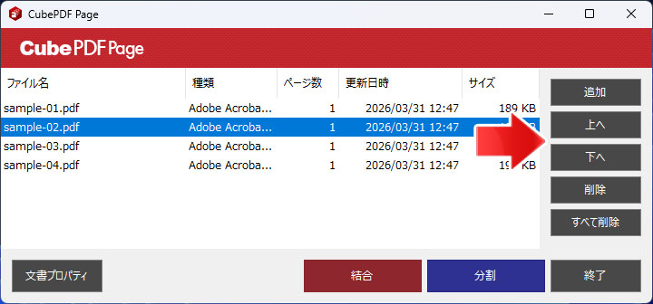 ファイルを選択して「上へ」「下へ」ボタンを押すと、ファイルの並び替えができます。