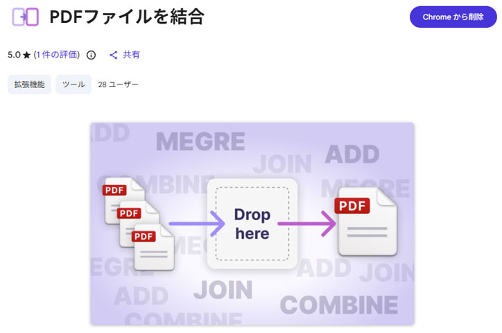 Chrome 拡張機能で PDF ファイルを結合できます。「PDFファイルを結合」という拡張機能を使います。