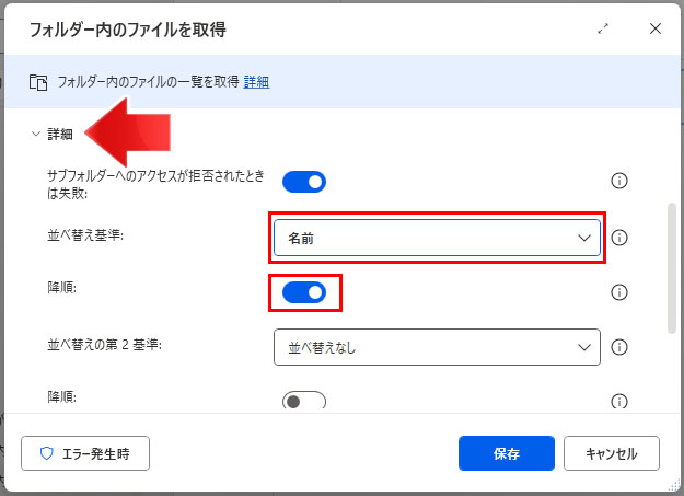 並び替え基準は「名前」。そして降順設定にしています。