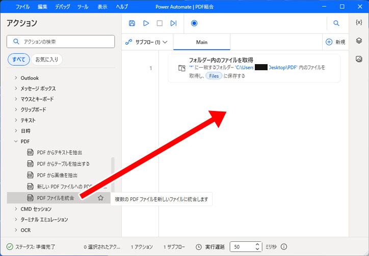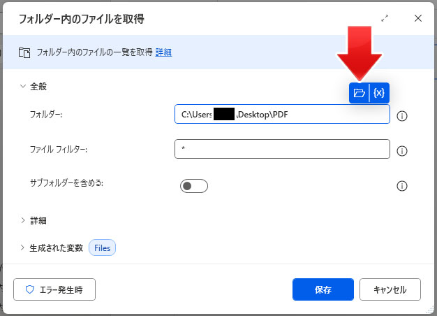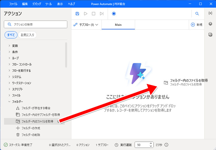 左メニューのフォルダーから「フォルダー内のファイルを取得」を右側へドラッグアンドドロップします。