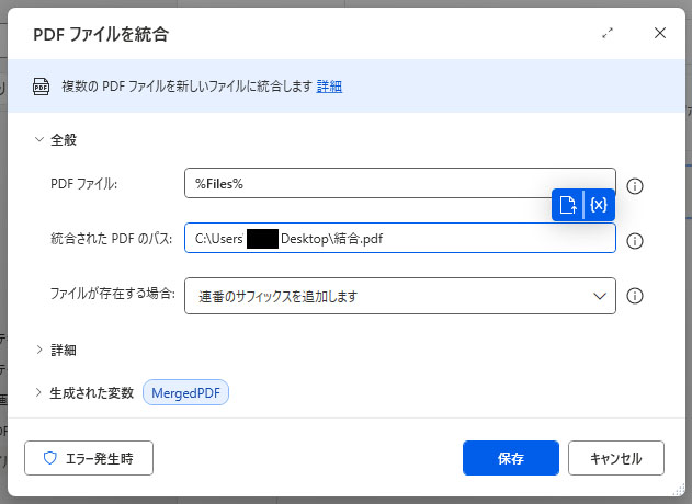 結合された PDF のパスには、保存場所のフォルダーを指定し、結合後のファイル名を入力します。