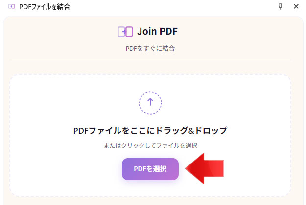 PDF を選択ボタンを押して結合したい PDF ファイルを選択するか、ドラッグアンドドロップします。