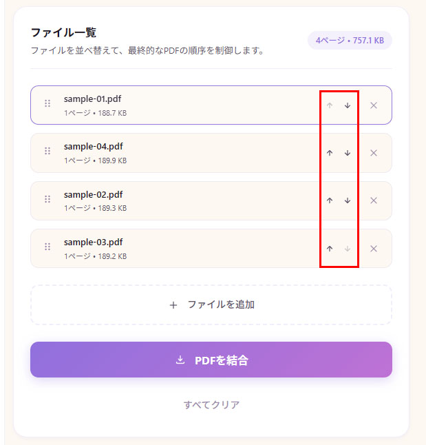 ファイル一覧の矢印ボタンを押すか、ファイルをドラッグすると並び替えができます。