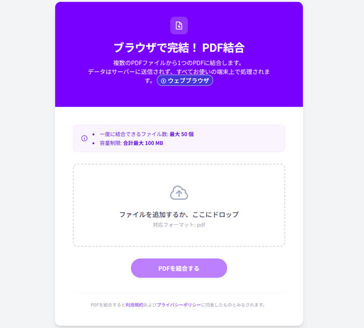 ブラウザのメモリ制限があるため、一度に結合できる PDF が50個、結合後の容量が100MB までという制限があります。