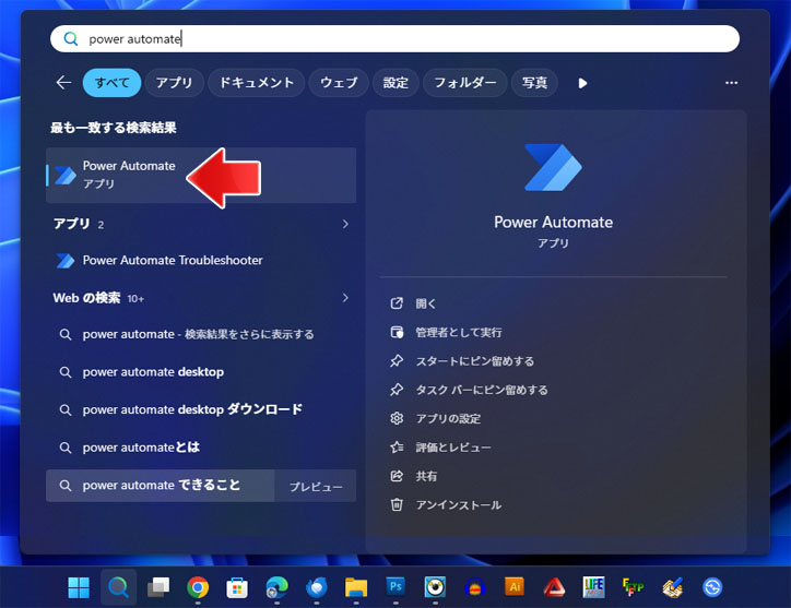タスクバーの検索から「Power Automate」を検索して Power Automate を開きます。