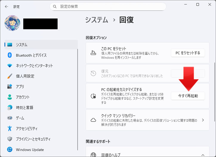 PC の起動をカスタマイズするの今すぐ再起動ボタンを押します。